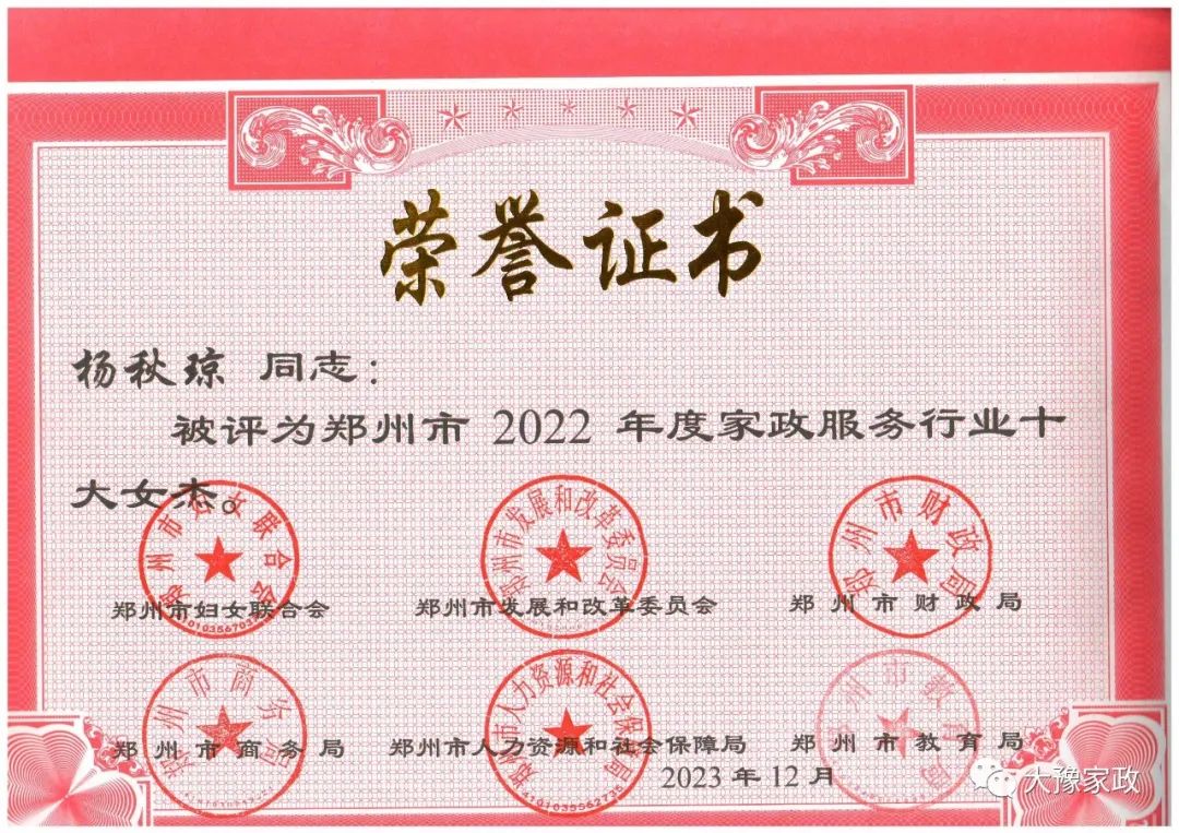 2024年大豫家政獲鄭州市婦聯(lián)、發(fā)改委、財政局、商務(wù)局、人社局、教育局表彰鄭州市2022年度優(yōu)秀家政從業(yè)人員