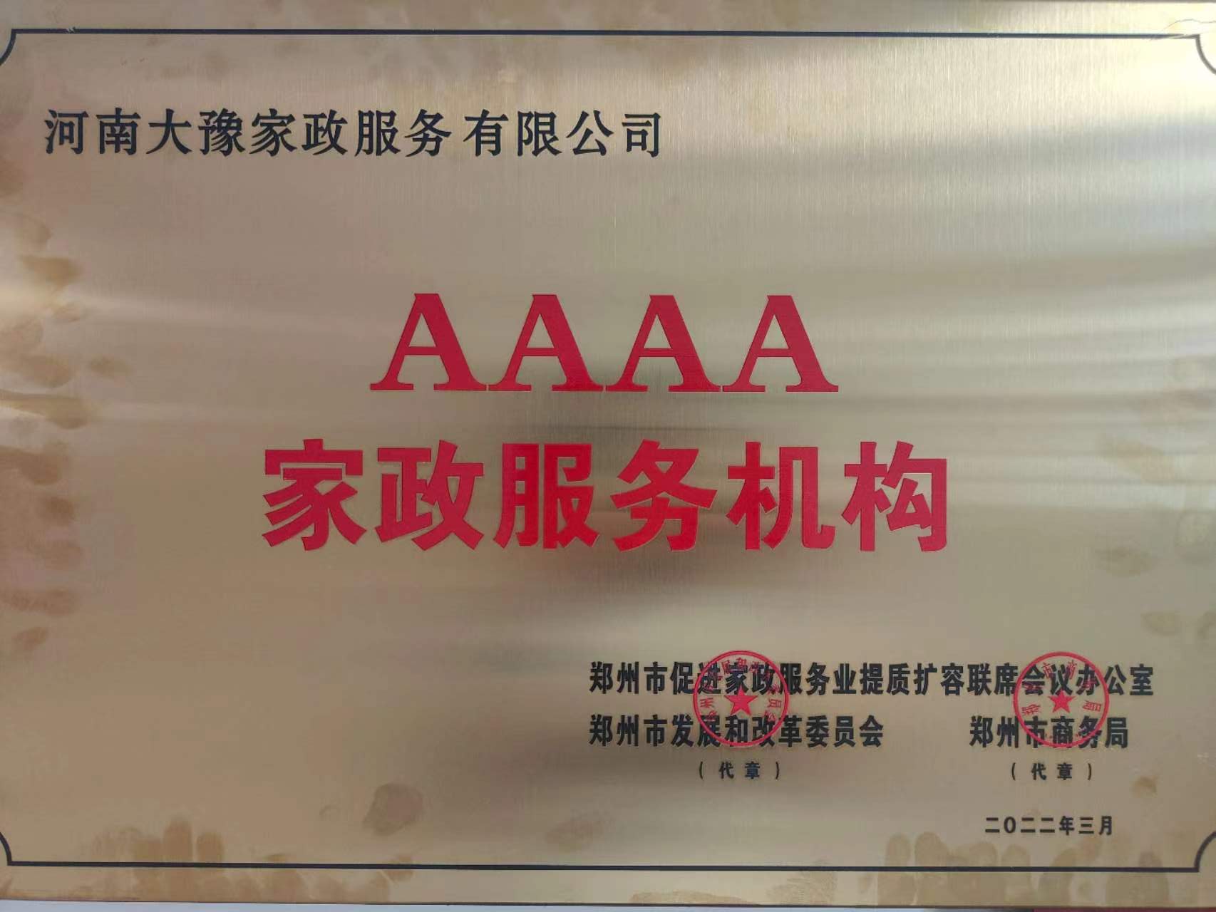 河南大豫家政服務(wù)有限公司被鄭州市促進(jìn)家庭服務(wù)業(yè)提質(zhì)擴容聯(lián)席會(huì )議辦公室、鄭州市發(fā)展和改革委員會(huì )、鄭州市商務(wù)局評選為鄭州市首批:“AAAA家政服務(wù)機構”。
