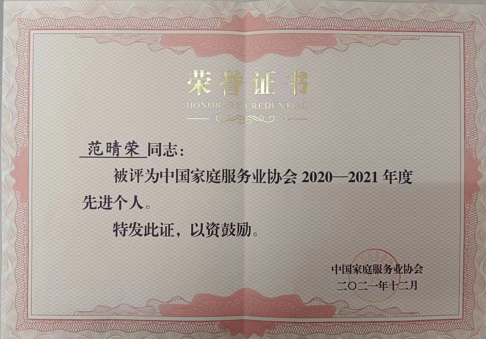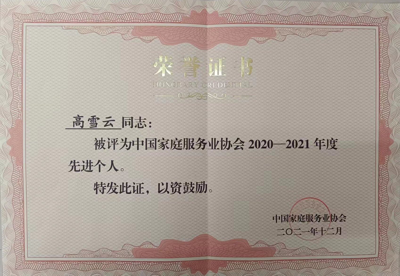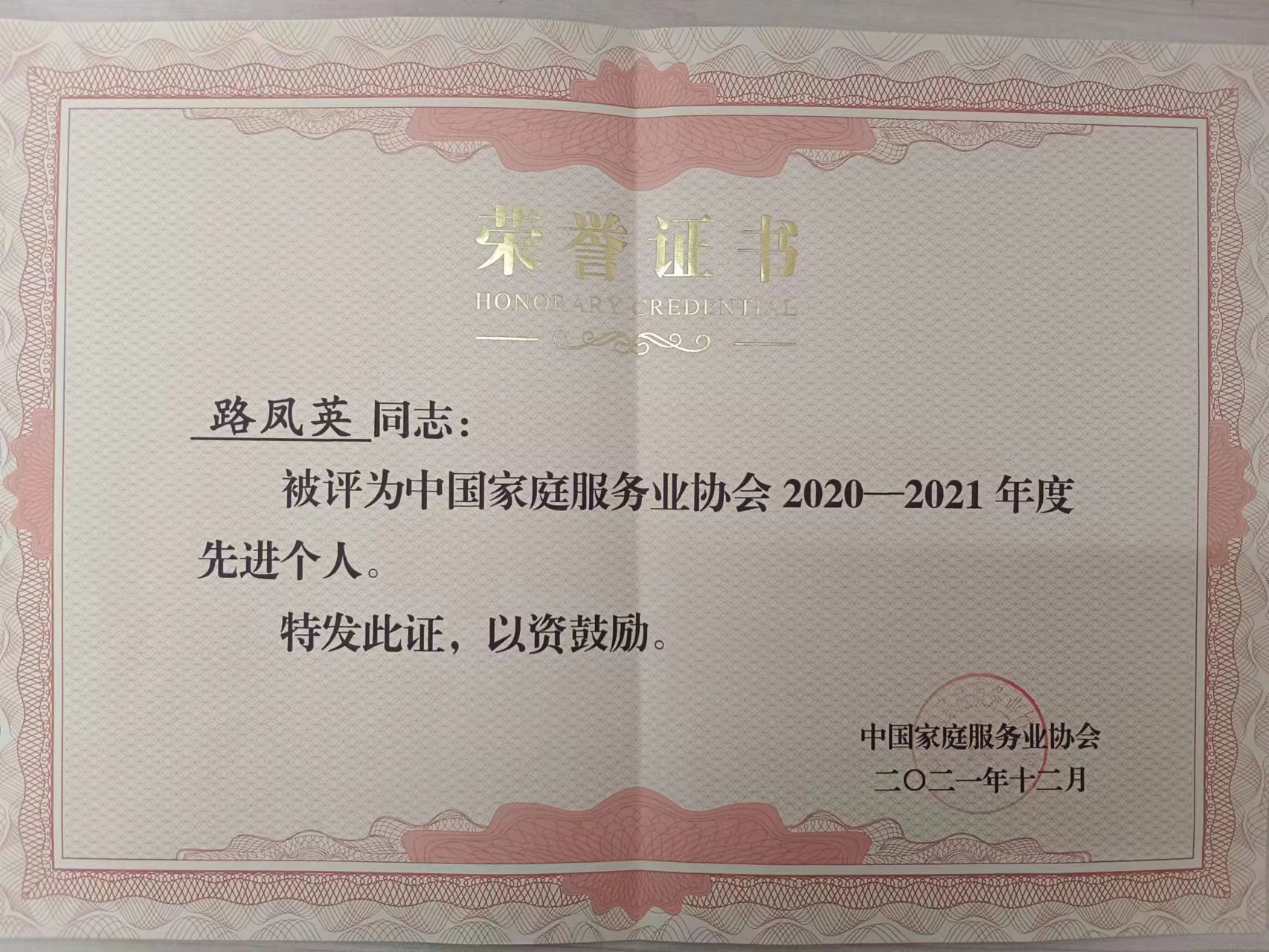大豫家政員工高雪云、路鳳英、范晴榮被國家庭服務(wù)業(yè)協(xié)會(huì )評為:“中國家庭服務(wù)業(yè)協(xié)會(huì )2020-2021年度先進(jìn)個(gè)人”。