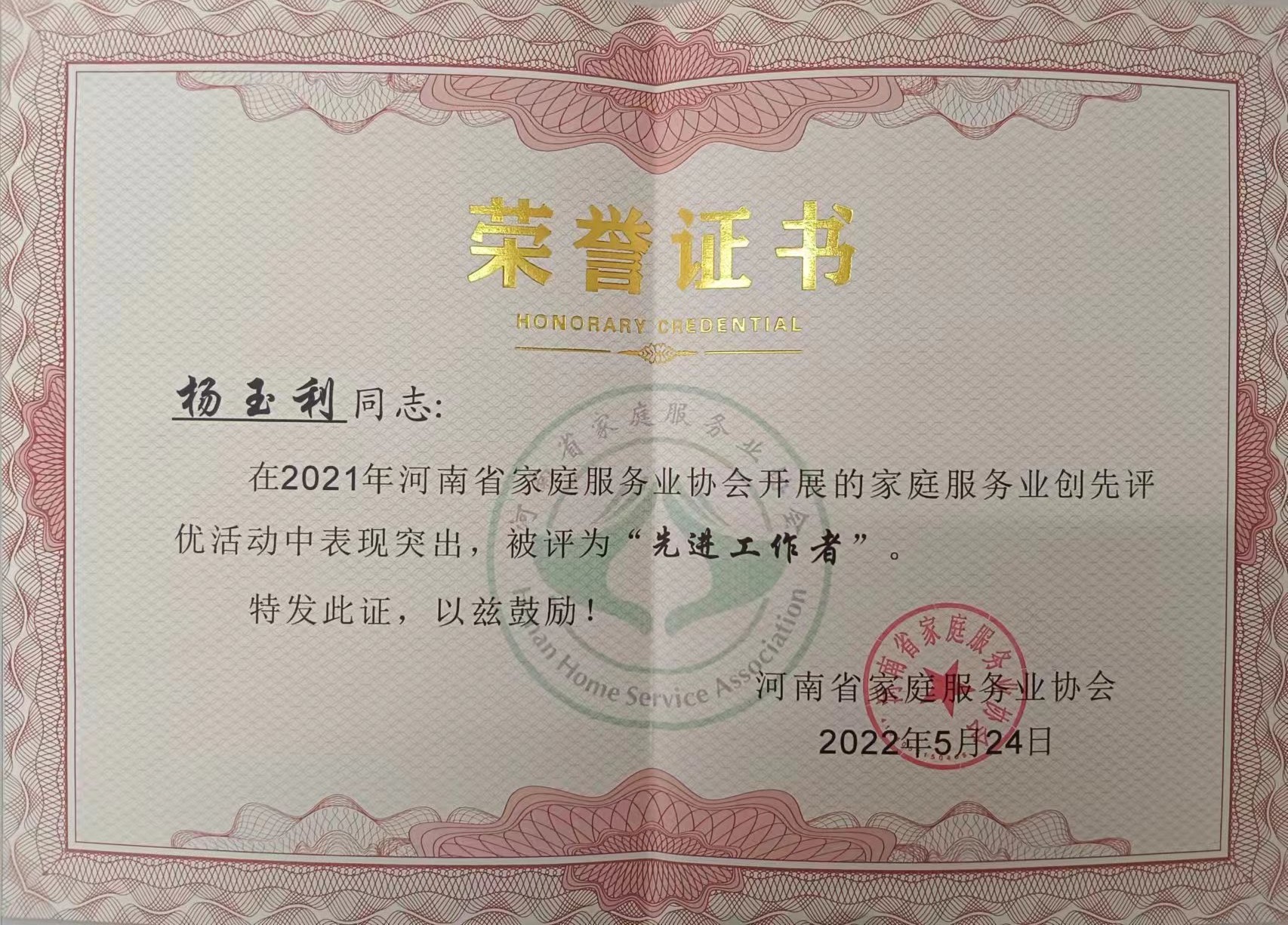 大豫家政員工楊玉利、劉紅、張燕燕被河南省家庭服務(wù)業(yè)協(xié)會(huì )評為:“先進(jìn)工作者”。