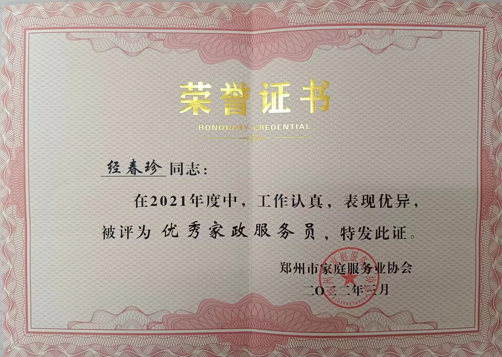鄭州市家庭服務(wù)業(yè)協(xié)會(huì )向會(huì )員單位的員工們頒發(fā)了2021年度榮譽(yù)證書(shū),河南大豫家政服務(wù)有限公司的優(yōu)秀員工們獲得證書(shū)。