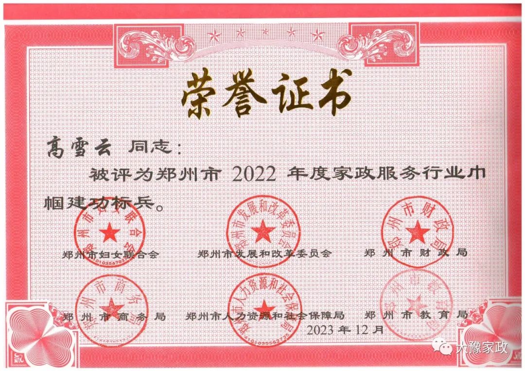 大豫家政保潔班長(cháng)高雪云被評為“鄭州市2022年度家政服務(wù)行業(yè)巾幗建功標兵”:
