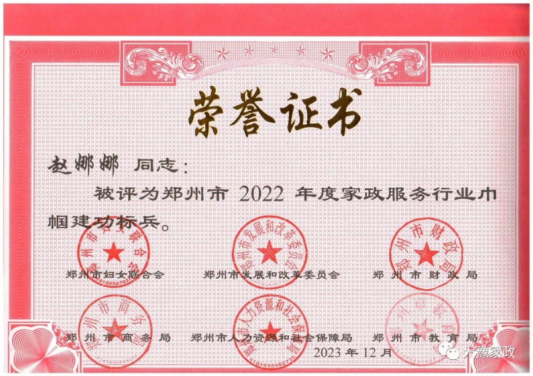 大豫家政保潔班長(cháng)趙娜娜被評為“鄭州市2022年度家政服務(wù)行業(yè)巾幗建功標兵”: