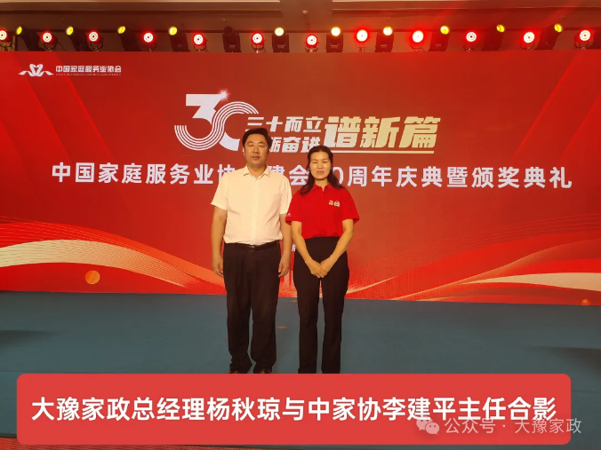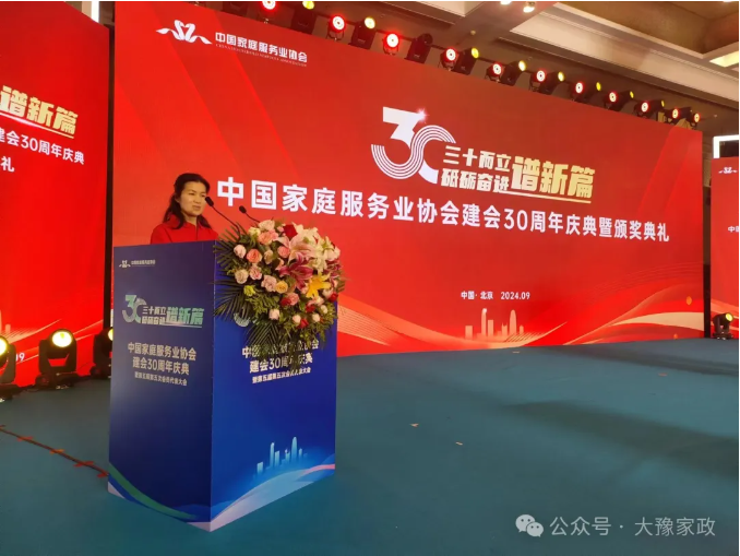 2024年9月26日,中國家庭服務(wù)業(yè)協(xié)會(huì )建會(huì )30周年慶典暨第五屆第五次會(huì )員代表大會(huì )在北京會(huì )議中心隆重召開(kāi)。河南大豫家政服務(wù)有限公司總經(jīng)理楊秋瓊女士代表大豫家政(入會(huì )20年以上的企業(yè))來(lái)到北京,參加此次重要會(huì )議。