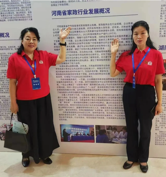 大豫家政總經(jīng)理楊秋瓊女士與鄭州市家庭服務(wù)業(yè)協(xié)會(huì )協(xié)會(huì )會(huì )長(cháng)王瑜女士在河南省家政行業(yè)發(fā)展概況前合影。
